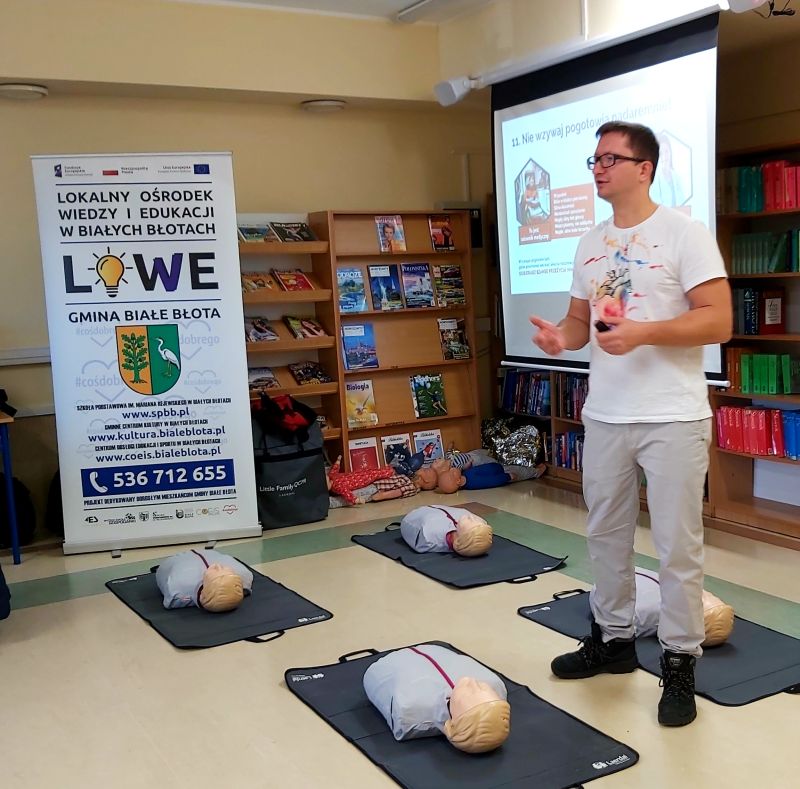 Wczoraj do późnych godzin popołudniowych szkoliliśmy się z Pierwszej Pomocy, a dziś od samego rana oferujemy zajęcia w Szkole Podstawowej im. M. Rejewskiego w Białych Błotach :